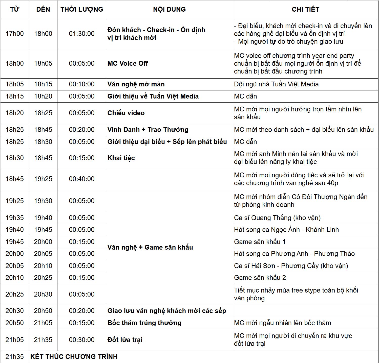 Đây là lúc bạn biến các giai đoạn thành một bảng timeline Year End Party chi tiết đến từng phút. Với mỗi hạng mục, bạn cần liệt kê rõ: Thời gian bắt đầu – kết thúc, Nội dung hoạt động, Người phụ trách và Nhân sự hỗ trợ (âm thanh, ánh sáng, PG).